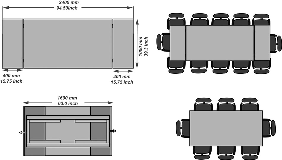 Product Size: | 1600mm W (2400mm when extended) x 1000mmD x 760mmH ( with 2* 400 mm laternal extension leaf) |